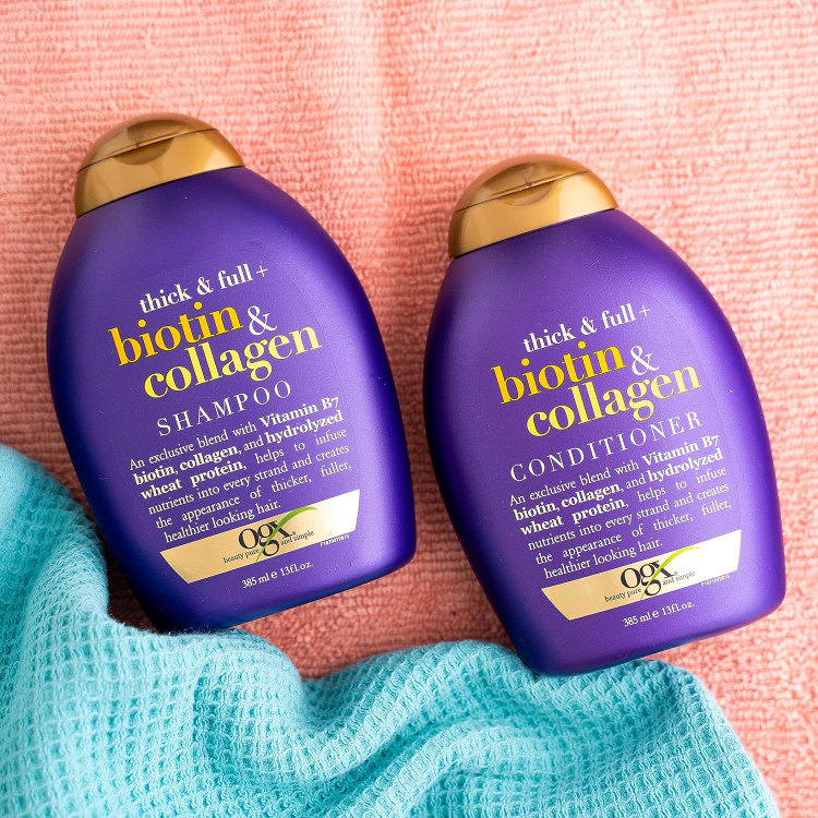 شامپو بیوتین و کلاژن او جی ایکس (شامپو بنفش ogx)، یک شامپو مو تخصصی و حرفهای خارجی برای ضخامت بخشیدن به موهای نازک و کم حجم است که با ترکیبات فعال خود، قادر است ساختمان تارهای مو را نیز ترمیم نماید. مکمــلهای کلاژن و بیوتین در این شامپوی محبوب، بطور موثری در درمان موهای خشک و شکننده یا آسیب دیده، موفق خواهند بود. آبرسانی و ترمیم ساختار مو از مراقبتهای رایج برای داشتن موهایی سالم و زیبا است که اکنون او جی ایکس OGX با شامپو بیوتین و کلاژن خود، شما را در تحقق یافتن آن یاری خواهد کرد. این شامپو بدون سولفات نیز می باشد.
